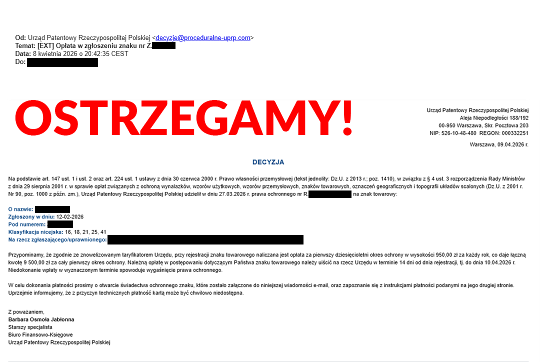 Prosimy Państwa o wzmożoną czujność, a w przypadku wątpliwości o kontakt z Urzędem Patentowym RP pod nr tel. 22 579 05 55 lub e-mailem: Centrum.Kontaktowe@uprp.gov.pl bądź też ze swoim pełnomocnikiem.