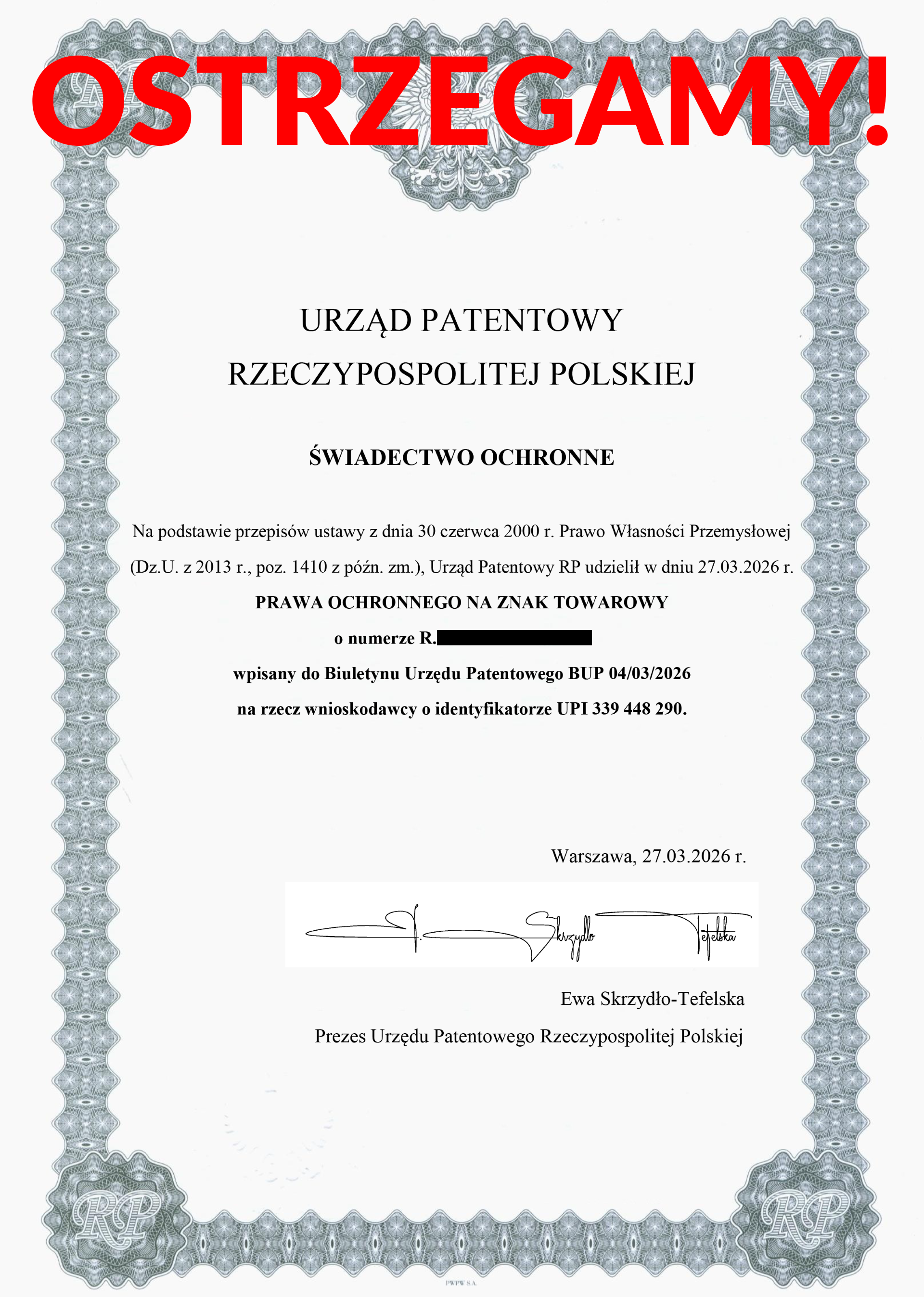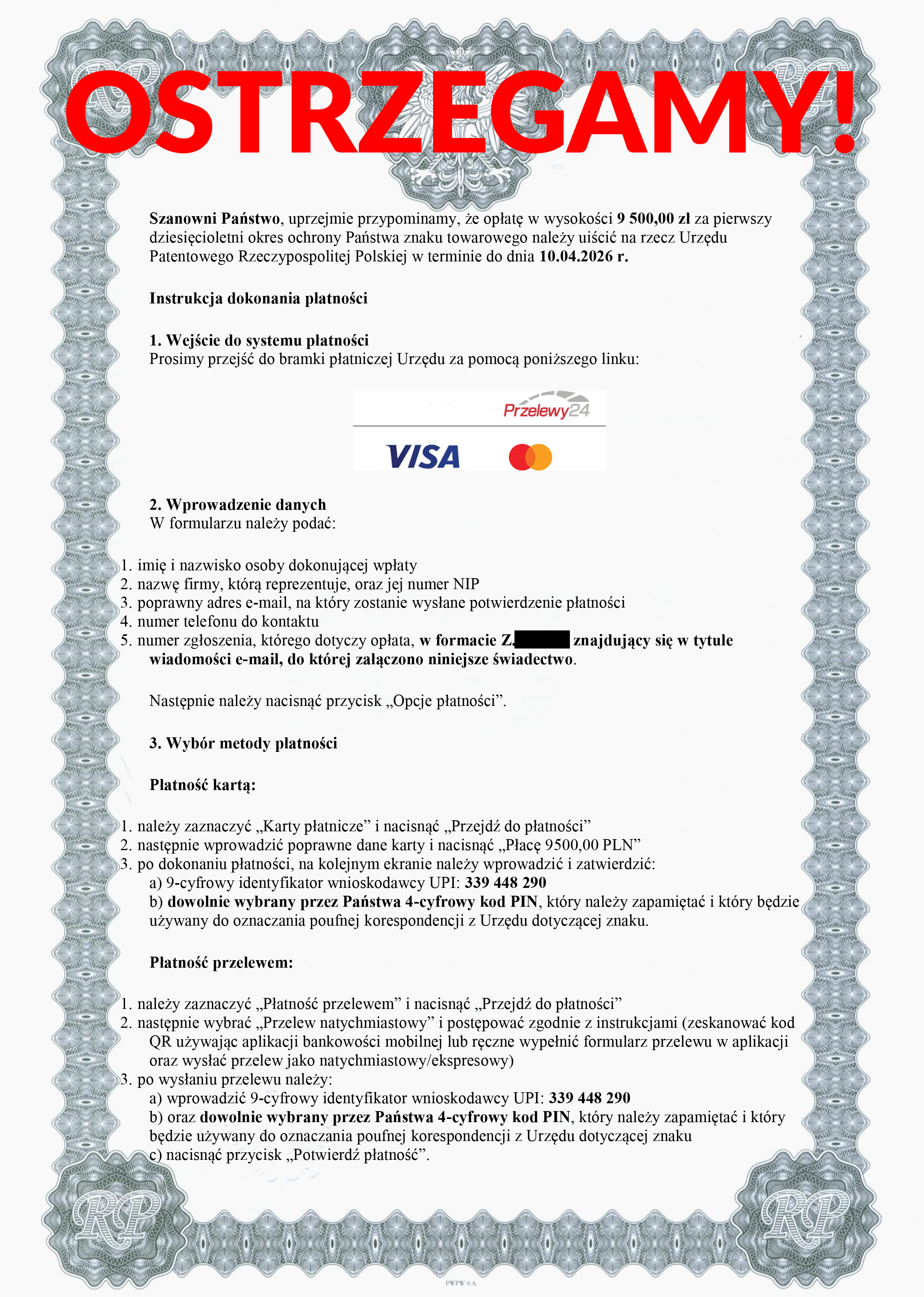 W treści świadectwa umieszczają zapis: „Szanowni Państwo, uprzejmie przypominamy, że opłatę w wysokości 9 500,00 zł za pierwszy dziesięcioletni okres ochrony Państwa znaku towarowego należy uiścić na rzecz Urzędu Patentowego Rzeczypospolitej Polskiej w terminie do dnia (…)”. Następnie jest wskazana Instrukcja dokonania płatności, a link odsyła do systemu płatności, a więc odesłanie wygląda bardzo wiarygodnie, co dodatkowo wprowadza klientów w błąd.